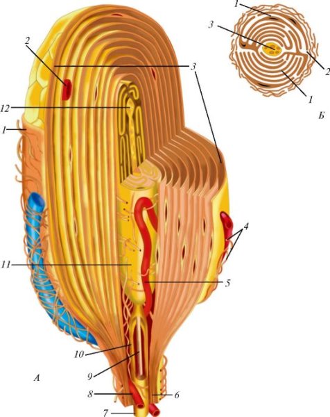 Это миелинизированное нервное окончание (дендрит) (кстати, оно относится к самым высокоскоростным, то есть, к А-альфа волокнам), кончик которого покрыт несколькими слоями (как луковица, чешуйками) клеток - ламелями.